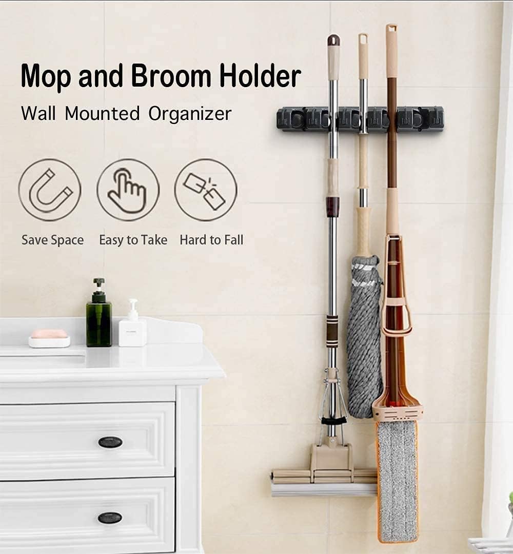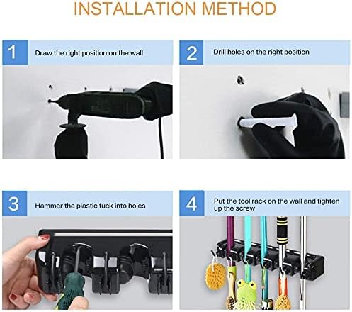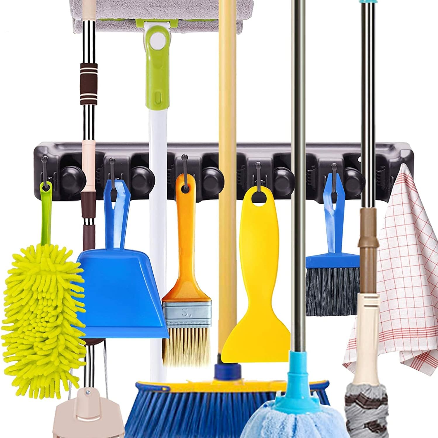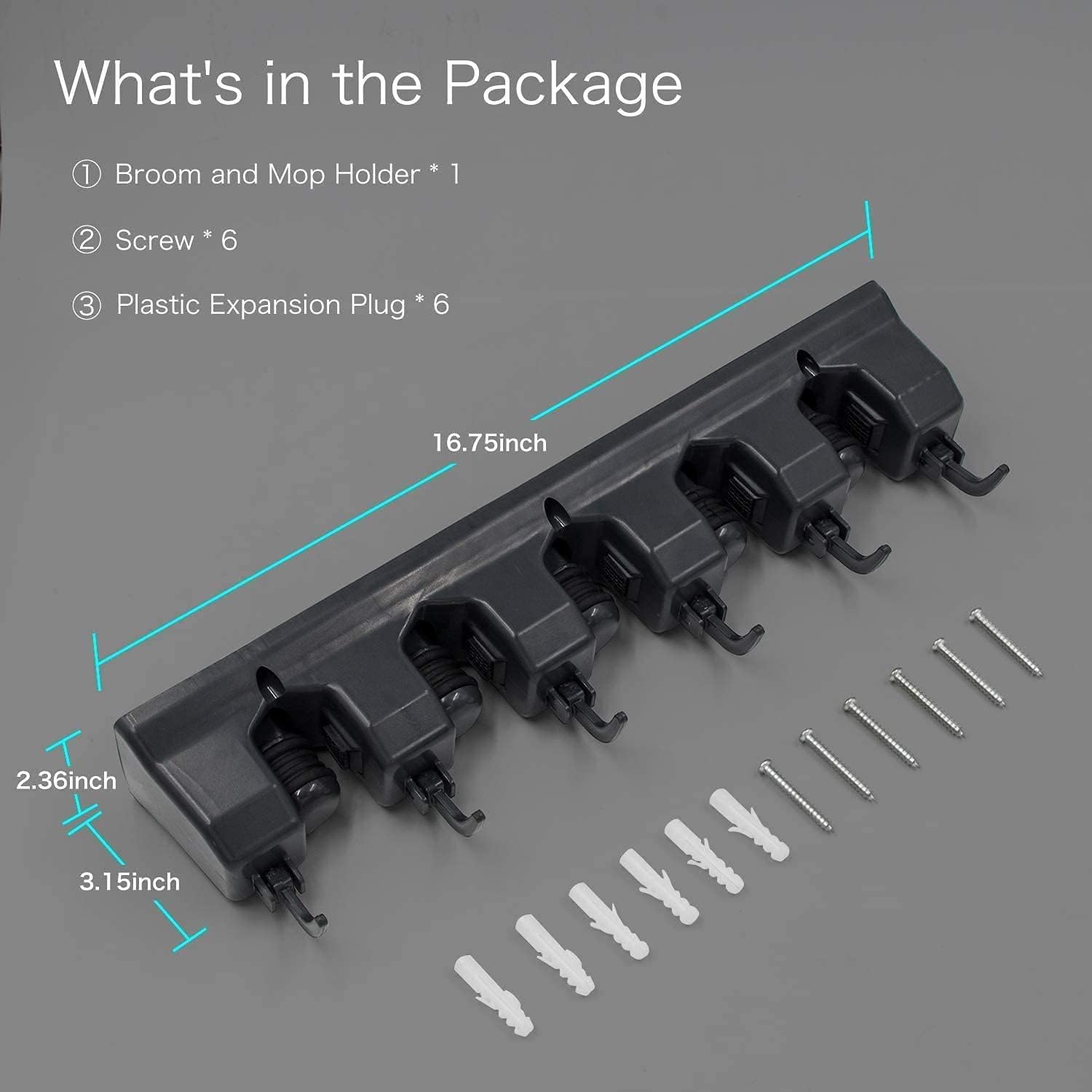 Con 11 puntos de almacenamiento en total (5 ranuras para escobas y trapeadores y 6 ganchos adicionales), este soporte para escobas para montar en la pared ahorra espacio y mantendrá todo perfectamente en su lugar, Para interiores o exteriores